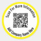 Una imagen de visualización está en el centro del pegatina. Puede reemplazarlo con su código QR. Hay dos líneas de texto en negro que puede editar para mostrar el mensaje de su personalizado. (Se muestra: Buscar más información Añadir aquí el nombre de la empresa) Estos pegatinas tienen texto negro en un círculo blanco. El pegatina tiene un borde amarillo brillante.