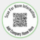 Una imagen de visualización está en el centro del pegatina. Puede reemplazarlo con su código QR. Hay dos líneas de texto en negro que puede editar para mostrar el mensaje de su personalizado. (Se muestra: Buscar más información Añadir aquí el nombre de la empresa) Estos pegatinas tienen texto negro en un círculo blanco. El pegatina tiene un borde verde claro.