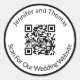 Puede introducir la dirección URL del sitio web del boda para cambiar la imagen de visualización a su código QR. Hay dos líneas de texto en negro que puede editar para mostrar un mensaje personalizado. Estos pegatinas de código QR tienen texto negro en un círculo blanco. El pegatina tiene un borde negro.