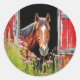 Cabeza de caballo mirando por la puerta del granero con flores rojas