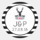 pegatina boda con la cabeza de ciervo negro con grandes cuernos. Las líneas geométricas dentro de la cara del ciervo agregan un toque creativo. Flores rosas y coloridas hojas verdes de menta forman un ramo floral de bonito bajo su cabeza. Un sketch de cordillera colocado entre las flores también le da un toque rústico al campo. El fondo es un patrón rayado en blanco y negro. Personaliza con las iniciales y la fecha del boda de la novia y el novio.