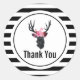 Gracias pegatinas con la cabeza de ciervo negro hecha con líneas geométricas y usando una corona floral rosa. Diseño rústico y a la moda.El fondo es un patrón con rayas negras y blancas.