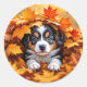 Pegatina Redonda Cachorro Adorable en Hojas de Otoño