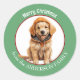 Una imagen de un adorable perro cachorro Golden Retriever con un gorra de invierno está en el centro de este pegatina de vacaciones. La imagen está enmarcada en un borde verde circular que contiene el texto personalizado en blanco. Cuto para tarjetas de Navidad, correspondencia y paquetes de regalo.