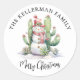 Add a festive touch to your holiday season with this playful round sticker featuring a whimsical watercolor snowman surrounded by tall saguaro cactuses and green succulents in the center. The name curves along the top edge, while “Merry Christmas” appears at the bottom for a cheerful finish.
