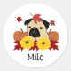 Pegatina Redonda Caer Pug con hojas, calabazas y girasoles