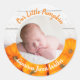 Este hermoso y moderno pegatina de fotos del día de Acción de Gracias presenta una fotografía de tu dulce recién nacido con las palabras Nuestra calabaza en naranja. Esta fotografía de otoño de bonito con madera blanca a la moda detrás del parche de calabazas es un elegante diseño de bebé para un nacimiento de Halloween o Thanksgiving.