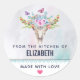 Pegatinas de cocina con un fondo de agua turquesa y pastel. Un cráneo boho de animales de moda con un ramo de flores en la cabeza y pequeñas mariposas revoloteando por ahí. Un bonito borde decorativo con pequeñas formas de lágrimas en azul claro. El texto dice Desde la cocina de<Personalized Name>Hecho con amor con un lindo corazón rosado.
