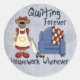 "¡Quillar para siempre - ¡Trabajo en casa cuando!" Diseño de actitud para los edredones. Un sillón azul con un edredón colgado sobre él, y un oso de mamá con un delantal y empujando una pezuña... ¡y sin demasiado encanto! El regalo perfecto para el cumpleaños, Día de la Madre o navidades de los edredones, o compre para usted mismo para anunciar su pasión por la aguja y el hilo.