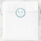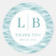 This elegant wedding sticker features a minimalist design with a circular emblem set against a textured water wave background in shades of light blue. The central white circle is bordered in teal, showcasing bold serif initials "L" and "B," separated by a vertical line, conveying a formal and sophisticated aesthetic. Below the initials, the phrase "THANK YOU" is elegantly displayed in matching teal serif font, creating a harmonious and inviting atmosphere. The overall layout is symmetrical and balanced, perfect for expressing gratitude at your special event.