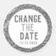 Un cambio moderno el pegatina de fecha con un cuadro de anillo purpurina plateado. Los sellos para sobres se pueden usar para compartir su cambio de planes en boda, compromiso, ducha de novia, ducha de bebé, fecha de celebración de fiestas.