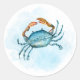Estos pegatinas redondos cuentan con un cangrejo azul acuático sobre una ola oceánica. Estas etiquetas son perfectas para el uso diario, eventos especiales de temática costera y bodas en la playa.