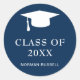 Modernos pegatinas de graduación con un diseño simple y masculino con "Clase de Año" en gran tipografía audaz junto con una tapa de grado y el nombre del graduado en blanco sobre un fondo azul marino. El color de fondo puede cambiarse para que coincida con el color de la escuela. Estos pegatinas son perfectos para un graduado y son grandes como sellos para sobres o para favores de fiesta.