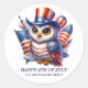 Pegatina patriótico con una bandera norteamericana roja, blanca y azul y un búho con sombrero top, y celebrando el 4 de julio. Personalizado con texto, "Feliz 4 de julio" y tu nombre o apellido. Comuníquese conmigo para obtener ayuda con sus personalizaciones o para solicitar productos adicionales de correspondencias o coordinación de Zazzle