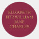 Pegatina con los primeros nombres de los personajes principales del Orgullo y Prejuicio de Jane Austen: Elizabeth, Fitzwilliam, Jane, Charles en falso oro contra un fondo púrpura rojizo. Pegatina perfecto para los amantes de la lectura y los aficionados a Jane Austen.