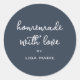 Rústico y moderno, hecho en casa con pegatina de amor, cuenta con una elegante caligrafía manuscrita en un fondo azul oscuro. ¡Perfecto para todos tus regalos caseros! Simplemente agregue su nombre a la etiqueta. Diseñado exclusivamente para usted por Happy Dolphin Studio!
