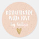Un pegatina "casero con amor" personalizado con un corazón dorado sobre un fondo de color rosa. Hazlo tuyo añadiendo tu propio nombre. Un toque de bonito para todos sus regalos de El día de San Valentín caseros y otras ocasiones de regalo. Diseñado para ti por Blackberry Boulevard.