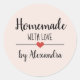 Moderno pegatina "casero con amor" con una fuente negra en un fondo rosa rubor adornado con un lindo corazón rojo. Texto personalizado.