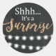 Pegatinas personalizadas para fiestas con fondo de pizarra, luces de hadas y las palabras "SHHH...ES UNA SORPRESA".