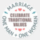 El matrimonio es entre un hombre y una mujer. El matrimonio NO es entre personas del mismo género, parejas múltiples, relaciones intestinales, menores, animales u objetos inanimados.