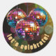 ¡Celebremos! pegatina con tres bailes de disco coloridas en un ambiente vibrante. El texto está en una fuente dorada. Si quieres otro texto, esto es personalizable y fácil de cambiar. Este pegatina se adapta a la mayoría de los eventos, fiestas y celebraciones. Añada a su correo, bolsas de regalo, suministros de fiesta u otros. Disponible en diferentes tamaños y formas. Hojas pegatinas de 6 ó 20.
