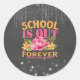 Celebremos el retiro de los profesores con este pegatina de pizarra con las palabras Escuela está fuera para siempre. Acentos rosas y amarillos con una hermosa flor rosa, para un pegatina amable del orgulloso profesor que se retira. Utilícelos para sellos para sobres y para hacer bolsos de favor.