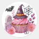 Ajoutez une touche de charme et de douceur à vos projets Halloween avec ce magnifique sticker rose featuring un délicat motif de fleurs, de chauve-souris, d'un chapeau de sorcière e un délicieux gâteau.