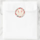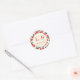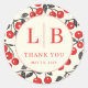 This wedding sticker features a charming circular design with a repeating cherry and leaf pattern, creating an elegant border around the central text. The color palette includes vibrant red cherries on a cream background, accented by black outlines for a fresh and lively look. The typography combines bold serif initials at the top with simple sans-serif text below, conveying gratitude in a stylish and modern way. Perfect for adding a personal touch to wedding favors or gifts, this sticker exudes a joyful and celebratory mood, ideal for commemorating special moments.