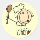 Un chef con un palo masculino en el gorra de un chef sostiene una cuchara de madera y el texto dice "Chef" con camisetas, llaveros, corbatas, delantales, mousepads, tarjetas y pegatinas.