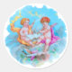 Dos cantantes se sientan sobre nubes celestiales, en forma de acuarela.