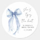Chic adhesivos para invitaciones de despedida de soltera, recuerdos y tarjetas de agradecimiento con una elegante aquarela de un lazo coqueto azul, "Ella está atando el nudo" en una tipografía moderna, y el nombre de la novia y la fecha de la fiesta en letra simple.