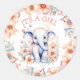 It's a Girl! Un dulce elefante bebé rodeado de flores rosas y coralinas color agua ilustracion pegatinas de ducha personalizados para una niña.