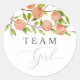 ¡El equipo de votación, rosa o azul, revela fiesta con este pegatina! Ilustracion acuarela de melocotones en una rama de árbol. El texto dice "chica de equipo".