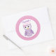 Una pequeña lechuza morada dulce con una flor rosa. Este lindo pegatina redondo se personaliza con sus propias 2 líneas de texto.