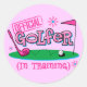 Este lindo diseño es perfecto para cualquier aspirante de pequeño golfista o campeón de máster, sobre todo si tiene un papá, mamá, abuelo o abuela que juega. Sello oficial, club de golf y bola de rebote, y flores en rosa brillante. El texto dice GOLFER OFICIAL (EN FORMACIÓN). ¡Un gran regalo para bebés o niños con camisetas, ropa, bolsas de té y más! ¡PinkInkArt original!