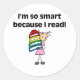 Un chica con una figura de palos cargando una gran pila de libros y textos que dice "¡Soy tan inteligente porque leo!" aparece en camisetas, mousepads, bolsas de tote, botones y otros artículos que promueven la lectura en niños!