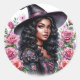 Pegatinas con acuarelas de una bruja de piel marrón vestida con un atuendo de bruja negra y rosa con un gorra de puntito, ¡rodeado de rosas rosas rosas! Una estética de bruja de barbullición femenina con un hermoso chica negro.