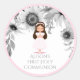 Chicas guapos, rosas y grises sagrados pegatinas de la comunión - chica dulce con el pelo largo y marrón en la vestimenta y oraciones de la cabeza en el centro. Elegante, blanco y negro, de aspecto vintage, los girasoles color agua bordean sobre fondo blanco. Enmarcado en un contorno rosado. Nombre personalizado y "Primera Santa Comunión" en elegante texto gris debajo. chicas florales de color rosa bonito comundan sellos para sobres para el verano y el otoño. Haga clic en la opción Personalizar para cambiar los colores del texto, el tamaño y las fuentes.
