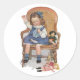 Niños de época ilustracion a un chica cosiendo muñecas mientras se sienta en una silla.