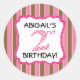 Este pegatina redondo presenta un tema de moda para los chicas de segundo cumpleaños. El fondo son rayas verticales de color rosa claro y marrón chocolate y un marco giratorio en el medio presenta un gran número dos rosa, que representa el segundo cumpleaños de su hijo. El texto del personalizable le permite agregar el nombre de su hijo. Consulte www.zazzle.com/daisylin712 para obtener una invitación coincidente.