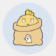 Pollo amarillo aburrido sentado en una bolsa de comida. ¿Atrapado? Yeah. ¿Preocupado? En realidad no.