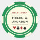 ¿Casarse en Las Vegas u otra ciudad de casino divertida? Estos pegatinas lustrosos, verdes y blancos, hacen una adición perfecta a una caja de favores, sobre, bufé de dulces y más. Personaliza tu diseño con tus nombres en negro en el centro, y una fecha boda, gracias, etc. en rojo arriba. Productos de coordinación disponibles. También disponible en otros colores. Cortesía gráfica de Revi Devi
