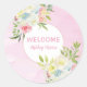 Pegatina de bienvenida al bebé con flores rosas, moradas, blancas, azules y amarillas personalizable con fondo morado. Perfecta para sellar sobres, bolsas de favores, para agregar a paquetes y mucho más.