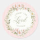 This sticker has a wreath of pink flowers in a wreath with a pink striped background with text that says "Christ the Lord is Risen."