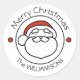This round sticker features a black line drawing of a cute Santa Claus with a red hat within a circle, with “Merry Christmas” greeting above and a family name below, and with red dots separating the two. Both the greeting and family name can be personalized right on the product page.