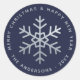 An elegant navy and silver sticker for the holidays greeting card. It has a faux silver foil snowflake in the center and silvery gray text in the circle around it: above it there is the message Merry Christmas & Happy New Year, under it there is the family name and the year.