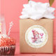 Christmas sticker is shown in a round shape with a cute festive pink snowman art print.