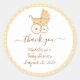 Pegatina redonda clásica de chupinada de bebé con acuarela que se puede utilizar como sello de sobre en las tarjetas de agradecimiento que envías a los invitados o que se pueden utilizar como parte del envoltorio del regalo o en las bolsas o cajas de los favores de la fiesta. Las pegatinas se pueden personalizar con la inclusión de un nombre y fecha de la chupinada. La pegatina presenta un cochecito minimalista de acuarela adorable.