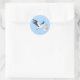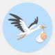 Pegatina Redonda Cigüeña llevando un paquete de bebé azul