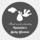 Pegatina Redonda Cigüeñas ricas cargando el paquete Baby Shower gri